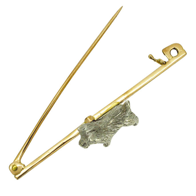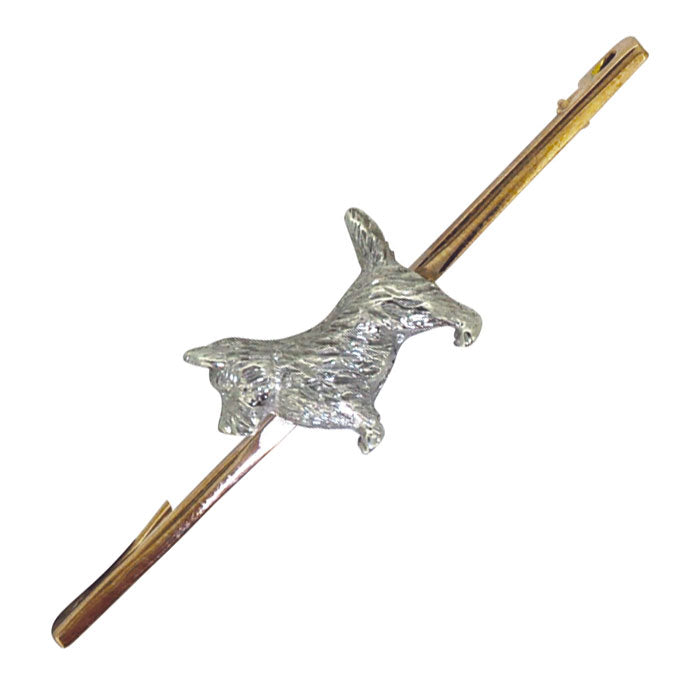 Silver dog with a textured coat on a 9ct yellow gold bar, with safety catch. Circa 1930s.