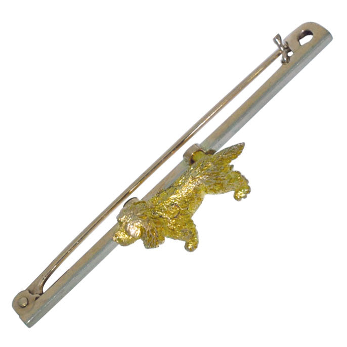9ct Yellow and white gold bar with a dog set to the centre. The dog has a lovely textured gold coat. With safety catch, circa 1930s.