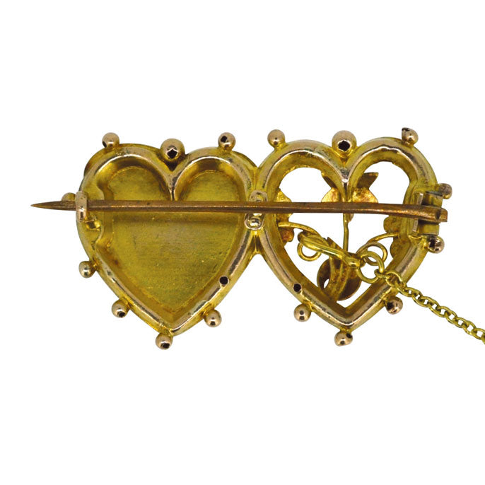 Victorian 9ct yellow and rose gold fancy 'MIZPAH' double heart brooch. Circa 1890. With safety chain.