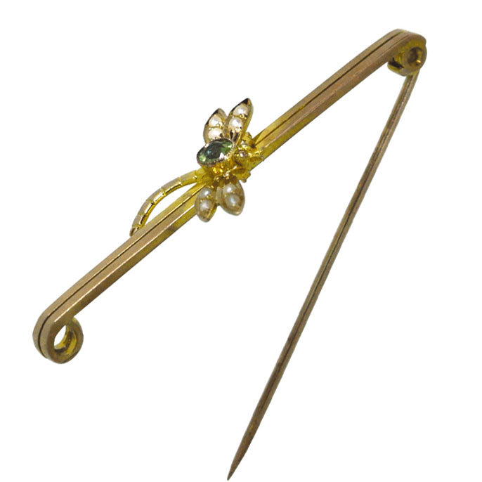 9ct Yellow gold bar with a pearl and peridot dragonfly set to the centre. Circa 1920's.