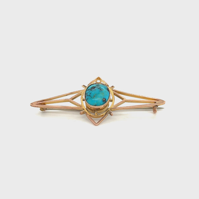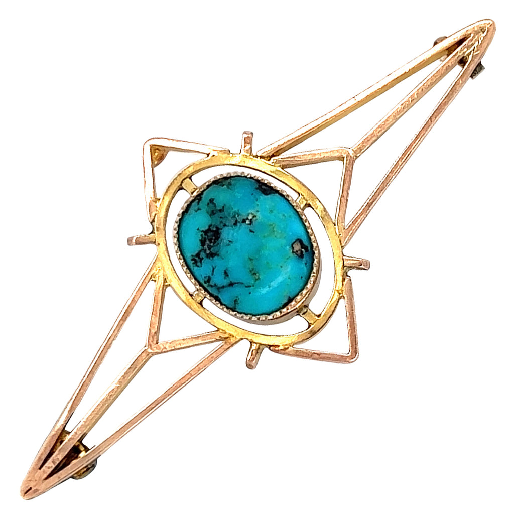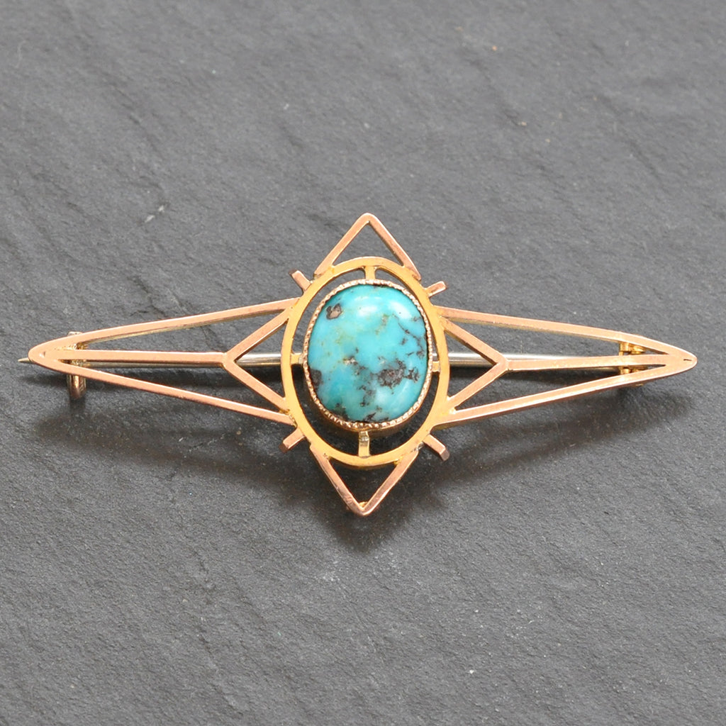 9ct Rose gold brooch with a single oval matrix turquoise set to the centre in a rub over setting. Circa 1910.