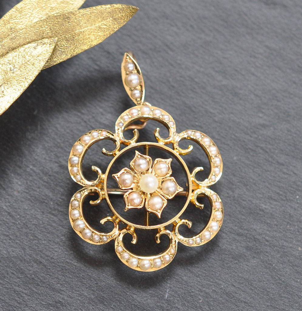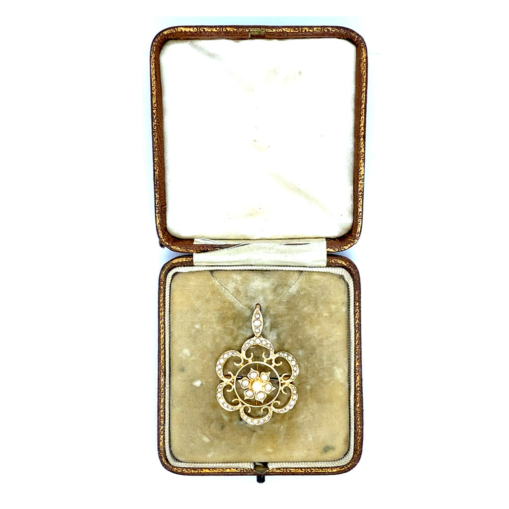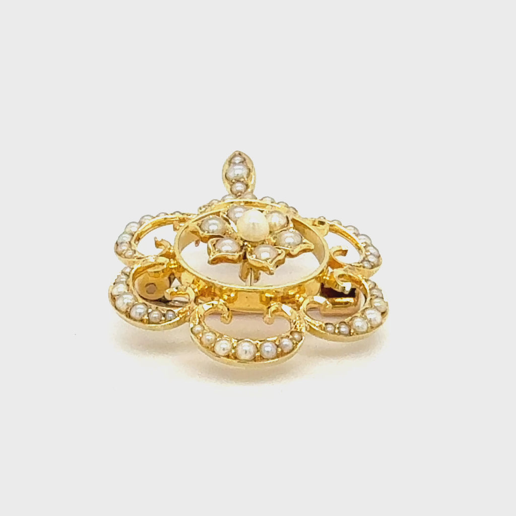 15ct Yellow gold pearl set circular brooch/pendant with a detachable loop. Circa 1890. In old original box. This is a fabulous piece of versatile jewellery. Great for any collection.