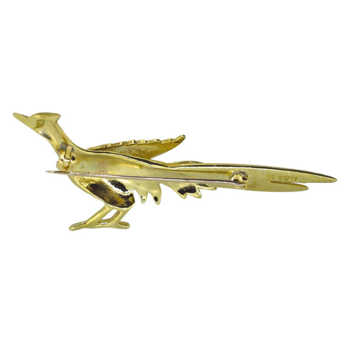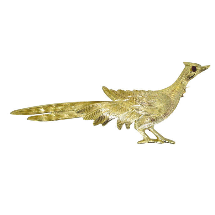 9ct Gold pheasant brooch with a ruby eye. With a rich texture to the gold 'feathers.' Hallmarked London 1965, with safety catch to the pin.