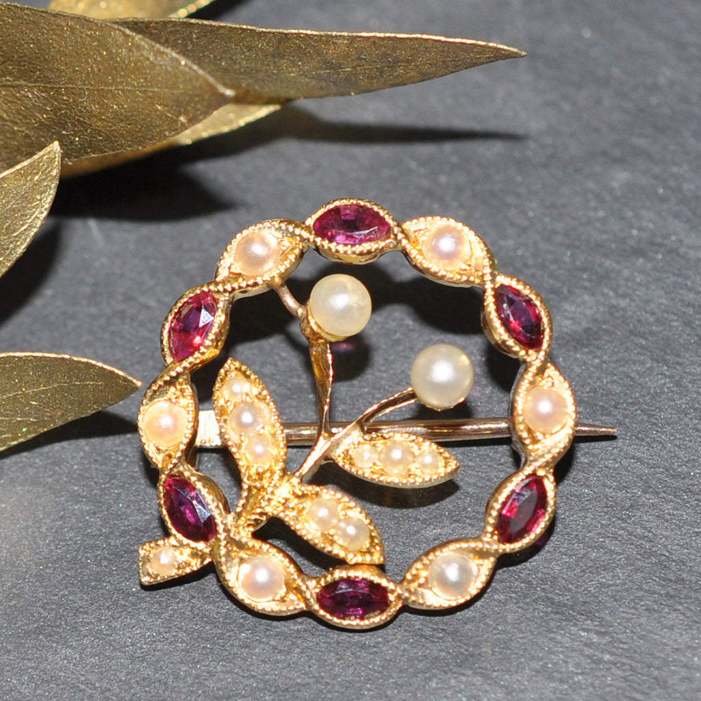 15ct Yellow gold fancy round brooch set with six rubies and seventeen pearls. Circa 1910.