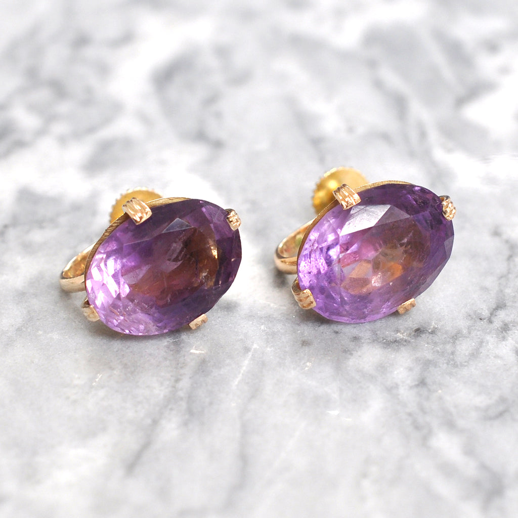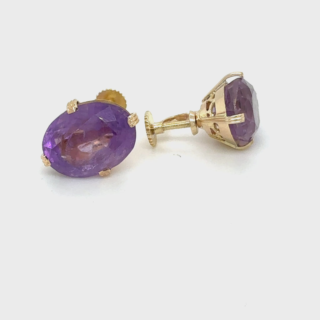 9ct Yellow gold amethyst earrings. Oval amethysts in claw setting with screw on fittings.