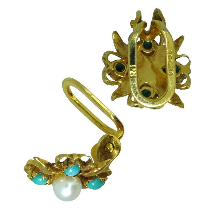 9ct yellow gold clip-on ear studs each set to the centre with a single cultured pearl surrounded by four turquoise, hallmarked and dated London 1970