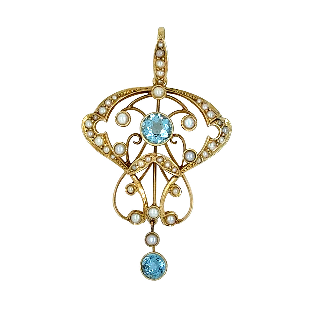 Edwardian 15ct yellow gold pearl and aquamarine pendant.