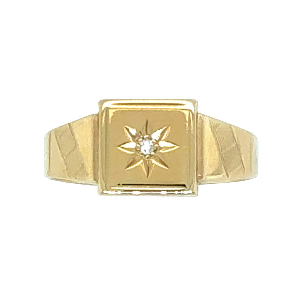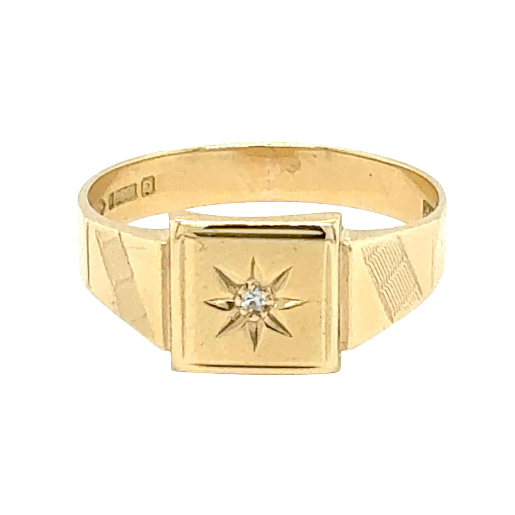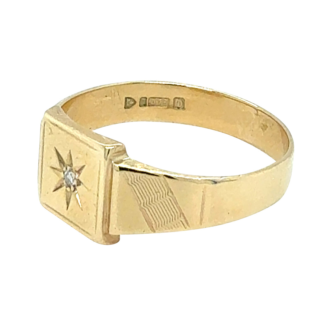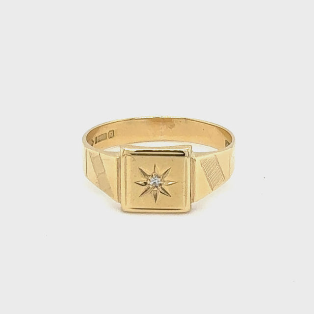 9ct Yellow gold single diamond set signet ring. Hallmarked and dated Chester UK 1954.