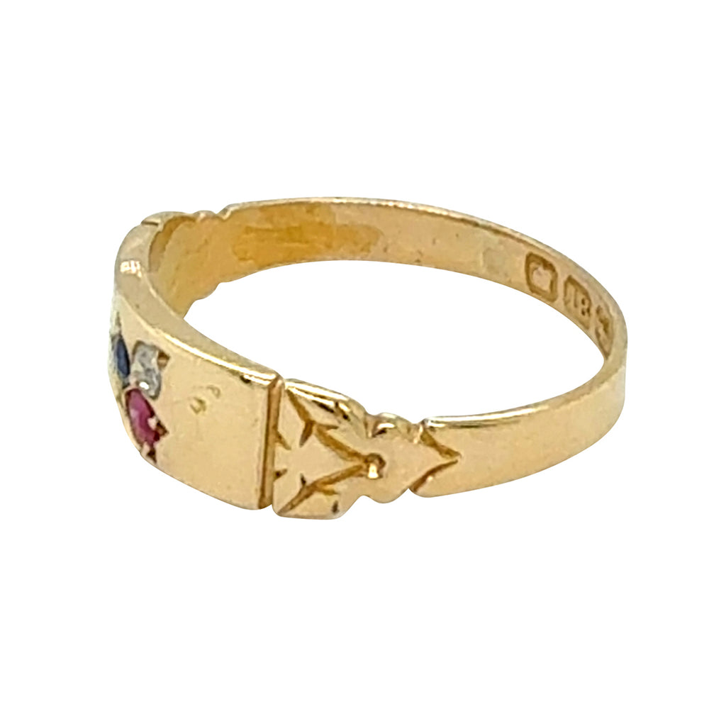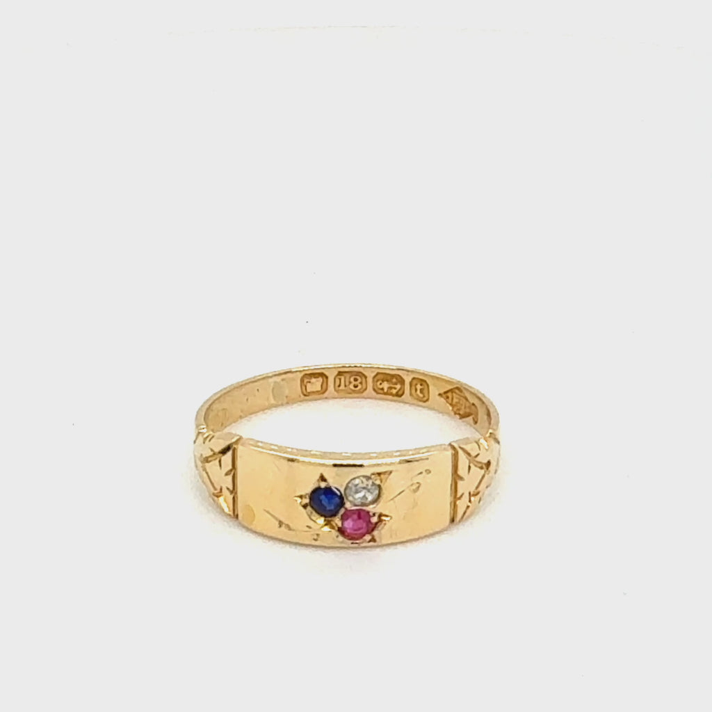 18ct Yellow gold gypsy ring with a single sapphire, ruby and diamond in rub over settings. Hallmarked and dated Birmingham UK 1893.