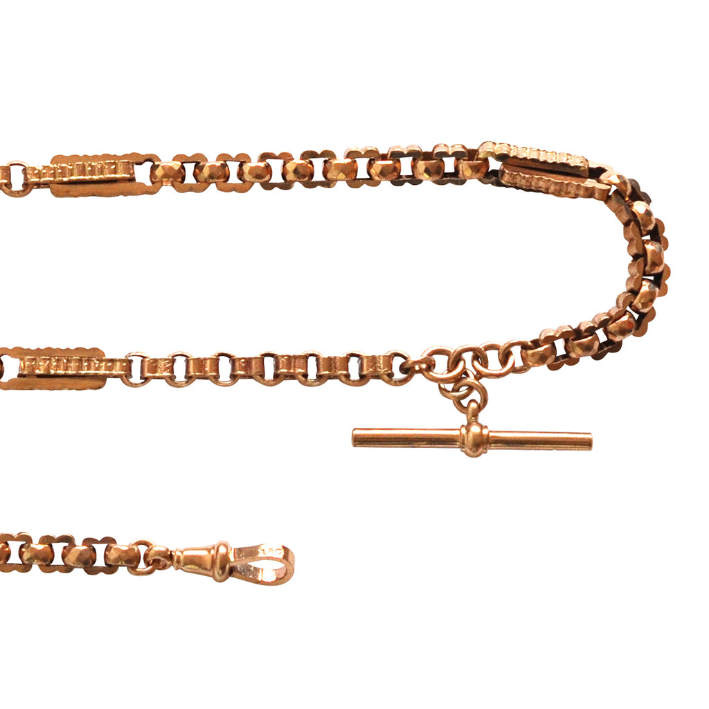 Victorian 9ct rose gold fancy link watch chain with T-Bar and dog clasps. A great watch chain to wear as a necklace. Circa 1890.